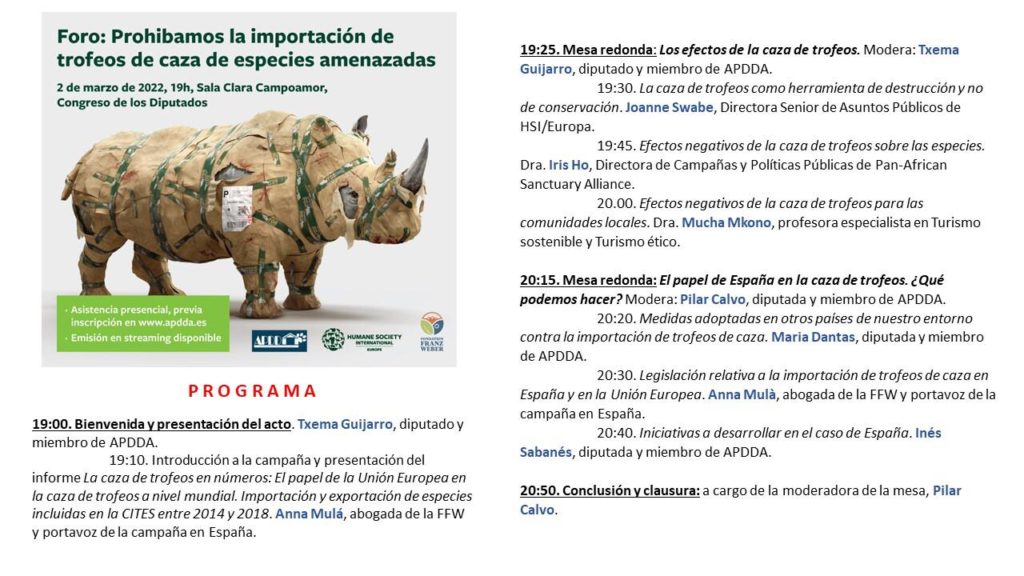 El próximo martes, 2 de febrero, a las 19h, tendrá lugar en la Sala Clara Campoamor del Congreso de los Diputados de Madrid el foro ‘Prohibamos la importación de caza de especies amenazadas‘, convocado por la Asociación Parlamentaria en Defensa de los Derechos de los Animales, (APDDA), en colaboración con la Humane Society International (HSI) y la Fundación Franz Weber (FFW).