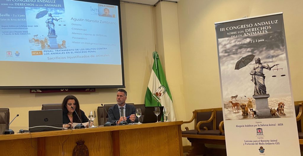 La última mesa de la jornada versó sobre el tratamiento penal en los casos de delitos contra los animales. Moderaba Myriam Ramos-Neble y el primer ponente fue Agustín Mansilla, criminólogo y miembro de nuestro colectivo. Mansilla analizó el término maltratar «injustificadamente» que aparece en la redacción del Código Penal y los motivos por los que aún no se ha conseguido eliminar del mismo. Quedó así en evidencia la necesidad de exigir al legislador que redacte en términos claros e inequívocos. Precisamente esa finalidad persiguen dos de las numerosas propuestas que venían siendo realizadas por INTERcids para una reforma del Código Penal en materia de maltrato animal, y que fueron aceptadas e incorporadas en el anteproyecto actualmente en tramitación: por un lado, eliminar el vocablo “maltratar” y, por otro lado, sustituir el término “injustificadamente” por la ausencia de amparo legal.