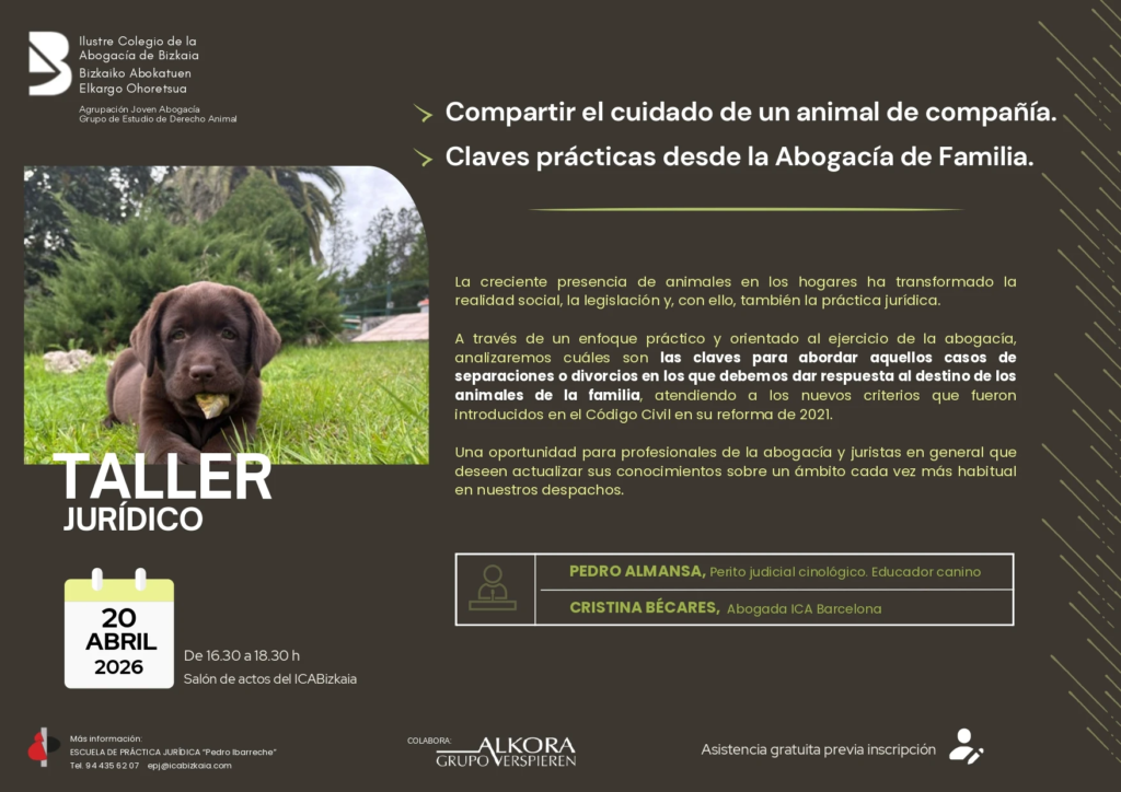 El próximo 20 de abril de 2026, el Salón de actos del Ilustre Colegio de la Abogacía de Bizkaia acogerá el taller jurídico Compartir el cuidado de un animal de compañía”, una iniciativa organizada por su Grupo de Estudio de Derecho Animal junto a la Agrupación Joven Abogacía.